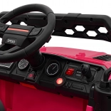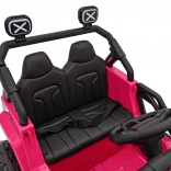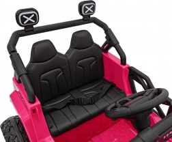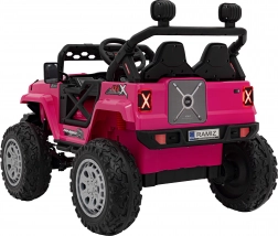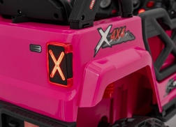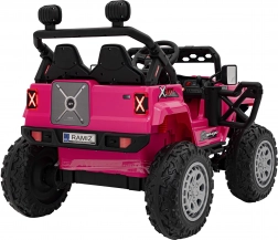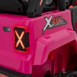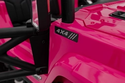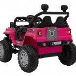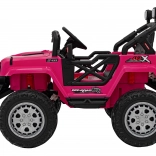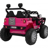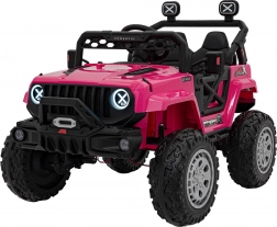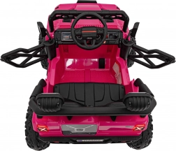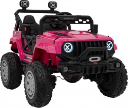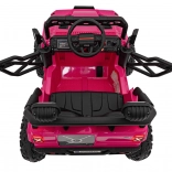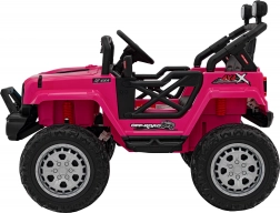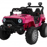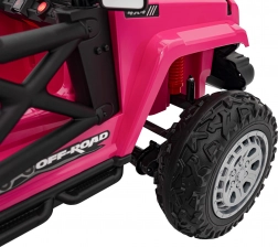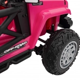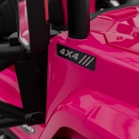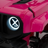 Toto ružové auto imituje skutočné off-road vozidlo s robustnou konštrukciou a veľkými, odolnými kolesami pre všetky terény.