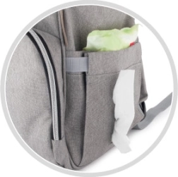 Premyslené členenie batohu s vodoodolným vreckom a umývateľnou prebaľovacou podložkou udrží všetky potreby prehľadne a hygienicky uložené.
