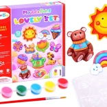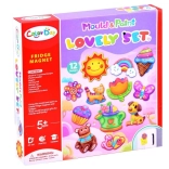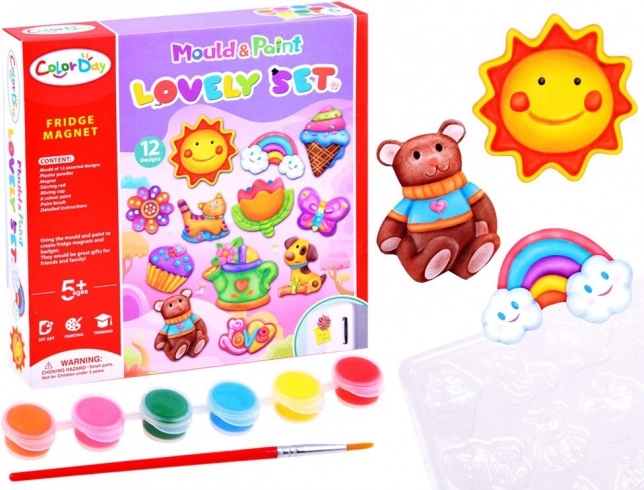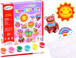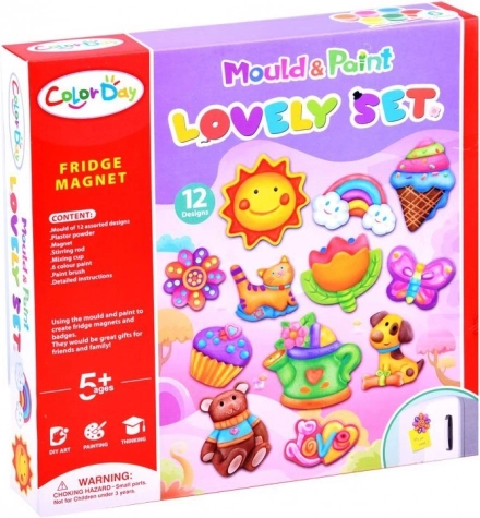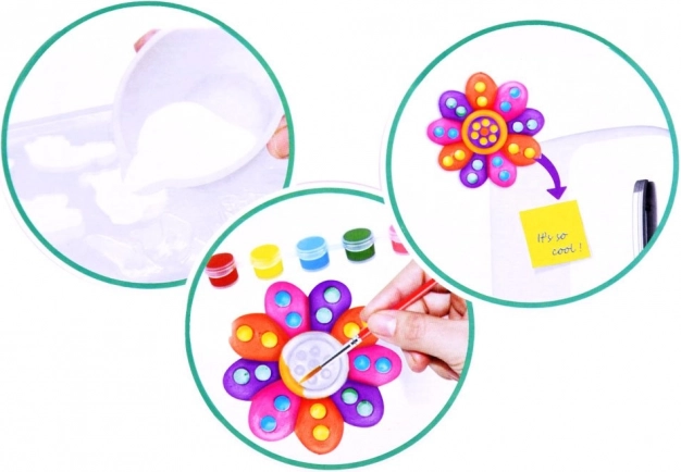 Táto DIY sada prináša deťom radosť z tvorby od prvého miešania sadry až po finálne maľovanie. Formy zahŕňajú obľúbené motívy ako slnko, kvety, motýle, dúhy, zmrzliny, košíčky, medvedíkovia, konvičky, mačky a nápis LOVE. Hotové výtvory stačí vybaviť magnetickou páskou a môžu ozdobiť chladničku, tabuľu alebo akýkoľvek kovový povrch.