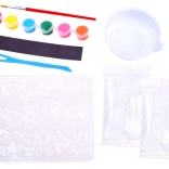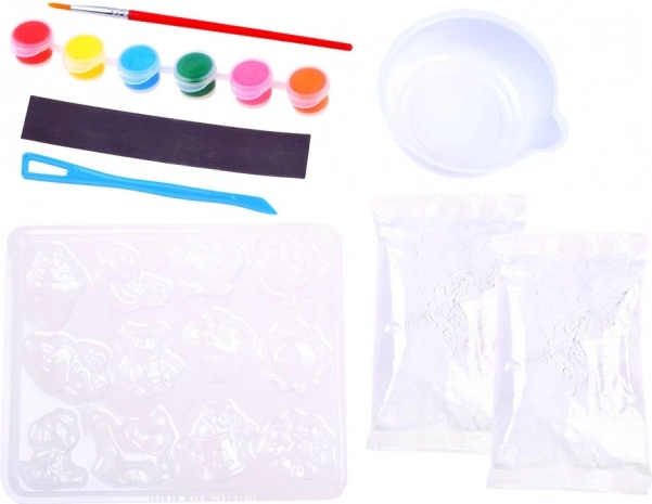 Sada obsahuje sadru, formy, misku, špachtľu, 6 farieb, štetec, magnetickú pásku aj návod. Stačí otvoriť a začať tvoriť.