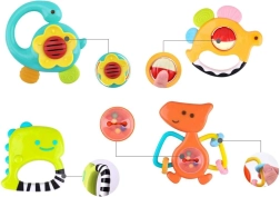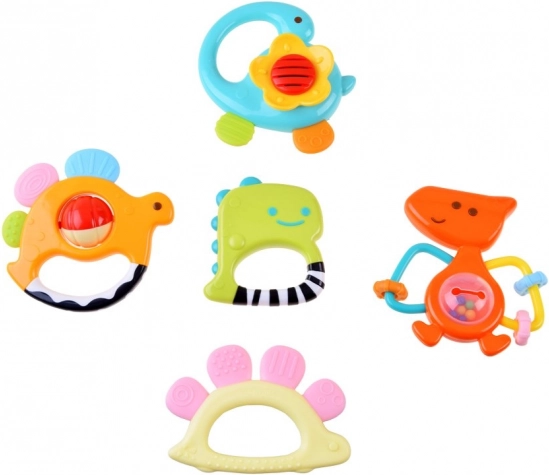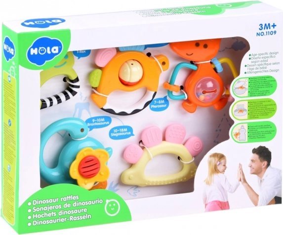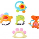Objavte súpravu hrkálok a hryzátok, ktorá je navrhnutá špeciálne pre najmenšie deti, ktoré práve začínajú objavovať svet. Táto súprava obsahuje päť hrkálok v tvare dinosaurov, každá z jasného plastu a bezpečná pre deti.