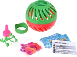 - Dvojdielna guľa s časovačom, obruba (adaptér), plniaca koncovka na vodné balóniky, karty s otázkami (EN), cca 30 balónikov, 6 opakovane použiteľných klipsov