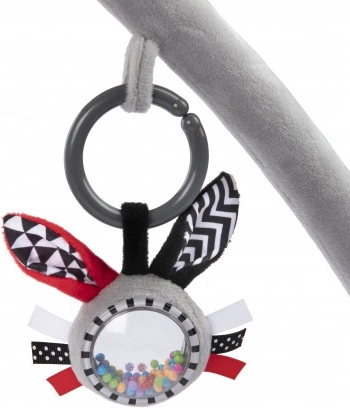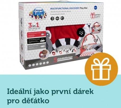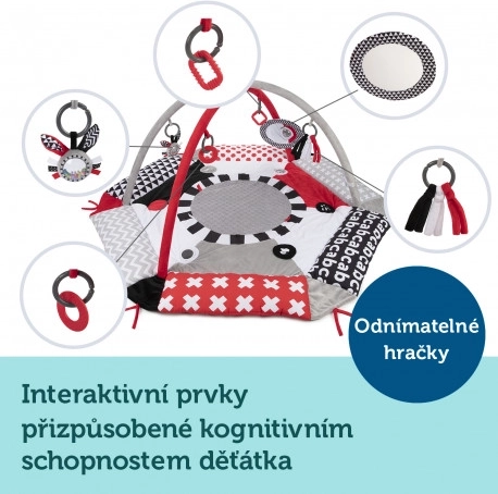 Hracia deka ponúka 5 odnímateľných hračiek na stimuláciu zmyslov a podporu vývoja: hrkálku, hryzátko, zrkadlo, farebnú stužku a pískaciu/šustiacu hračku.