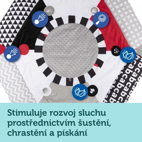Vďaka kontrastným farbám a rôznorodým textúram táto deka pomáha rozvíjať zrak a schopnosť sústrediť pozornosť už od raného veku.