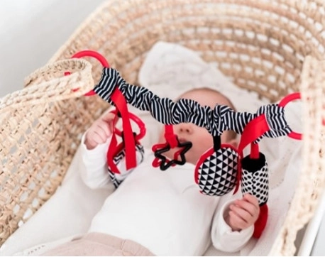 Kontrastná závesná hračka na kočík/autosedačku z kolekcie SENSORY. Závesná hračka so zrkadielkom je vhodná už pre najmenšie deti. Hračka má dve možnosti uchytenia a možno ju umiestniť na kočík, autosedačku alebo postieľku. Rôzne textúry materiálov stimulujú hmat dieťaťa. Zvončekové a šuštivé zvuky materiálov pútajú detskú pozornosť. Viacfarebné stuhy povzbudzujú dieťa, aby ich chytilo. Elastické hryzadlá upokojujú ďasná dieťaťa pri raste zúbkov. Senzorické farby stimulujú rozvoj zmyslov dieťaťa. Prečo sú senzorické hračky také dôležité? Zrak dieťaťa je po narodení najmenej rozvinutým zmyslom. Tma, ktorá prevláda v maternici, nedovoľuje, aby sa zrak v prenatálnom období plne rozvinul. Po narodení je zrak dieťaťa rozmazaný a hmlistý. Dieťa vidí iba obrysy v rozmedzí 20–30 cm, veľké tvary a prvky z prostredia. Približne po mesiaci začína vidieť farby, spočiatku červenú a čiernu. Asi za tri mesiace si začne všímať ďalšie výrazné farby. Približne vo veku šiestich mesiacov začína vidieť detaily na obrázkoch a vidí oveľa jasnejšie. V dvanástom mesiaci života je zrak dieťaťa už plne vyvinutý ako u dospelého a stáva sa skvelým nástrojom na objavovanie sveta. Senzorické hračky z novej kolekcie SENSORY tak pomáhajú stimulovať zrak dieťaťa a trénujú schopnosť sústrediť pozornosť už od prvých týždňov života. O kolekcii SENSORY: Senzorická kolekcia hračiek bola vyvinutá pre deti do jedného roka. Počas tohto obdobia dochádza k najvýznamnejším zmenám v psychomotorickom vývine dieťaťa. Senzorické hračky sú reakciou na aktuálny trend na trhu, ktorý sa zameriava na podporu rozvoja prostredníctvom zábavy, keď rodič spolu s dieťaťom môže stimulovať rozvoj zraku, precvičovať schopnosť sústrediť pozornosť na objekt, zameriavať a sledovať objekty očami alebo precvičovať obratnosť a koordináciu. Návod na použitie: Hračku udržujte v čistote. Spôsob prania je uvedený na všivke. Pozor! Dôležité pre bezpečnosť a zdravie vášho dieťaťa! Pred montážou odstráňte všetky obalové prvky. Uistite sa, že všetky malé hračky sú správne a bezpečne pripevnené k produktu. Hračku pripevnite k okraju striešky kočíka mimo dosahu dieťaťa a uistite sa, že je pevne pripevnená. Pred použitím musí byť montáž aj pripevnenie hračky skontrolované dospelou osobou. Plastový obal (balenie) uchovávajte mimo dosahu dieťaťa, predídete tak riziku udusenia dieťaťa obalom. Pred každým použitím skontrolujte kvalitu výrobku. Pri prvých známkach opotrebenia alebo poškodenia výrobok ďalej nepoužívajte – vymeňte ho za nový. Hračku používajte iba pod priamym dozorom dospelej osoby. Upozornenie! Nepoužívajte hračku pre deti, ktoré sa začínajú samostatne dvíhať na ruky a kolená. Predídete tým možnému zamotaniu dieťaťa do hračky. Hračka na kočík spĺňa certifikácie: ISO 9001 ISO 22716 Výrobok je navrhnutý a schválený v EÚ.