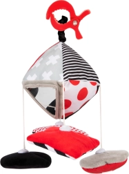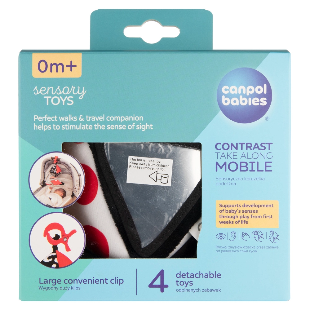 Podnecujte zmysly bábätka od prvých dní života s kontrastnou závesnou hračkou s klipom z kolekcie SENSORY. Vysokokontrastné čiernobielo-červené vzory, šuštiace a zvoniace prvky, hrkálka a dvojica bezpečných zrkadielok podporujú zrak, pozornosť aj motoriku. Vďaka praktickému klipu hračku ľahko pripevníte na kočík, postieľku alebo autosedačku. Odnímateľné plyšové prvky s magnetom prinášajú nové podnety pri každej prechádzke.