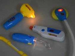 Tieto lekárske nástroje sú verné imitácie skutočných lekárskych prístrojov s priateľskými tvarmi a živými farbami. Set je perfektným darčekom pre malých medikov a bude určite zdrojom radosti počas zábavy. Kufrík s nástrojmi na prvú pomoc sa osvedčí v každej domácej zdravotníckej stanici. Hračky sú vybavené začiatočnými batériami AG13.