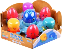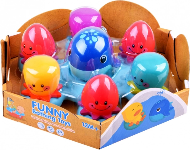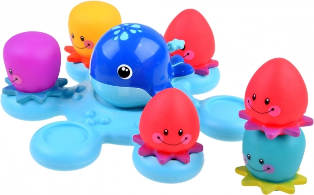- Interaktívna vodná zábava: veľryba s otvormi na striekanie vody, farebné chobotničky na kreatívnu hru.