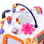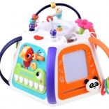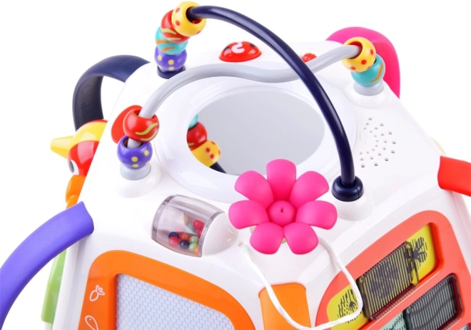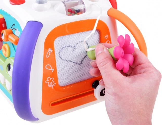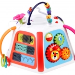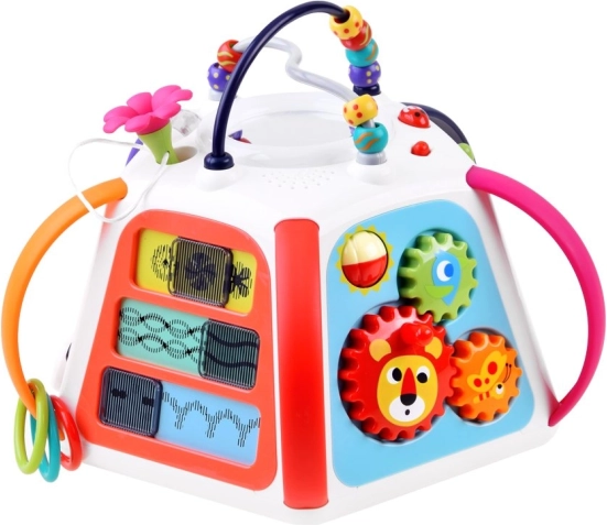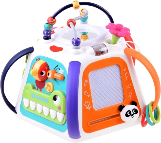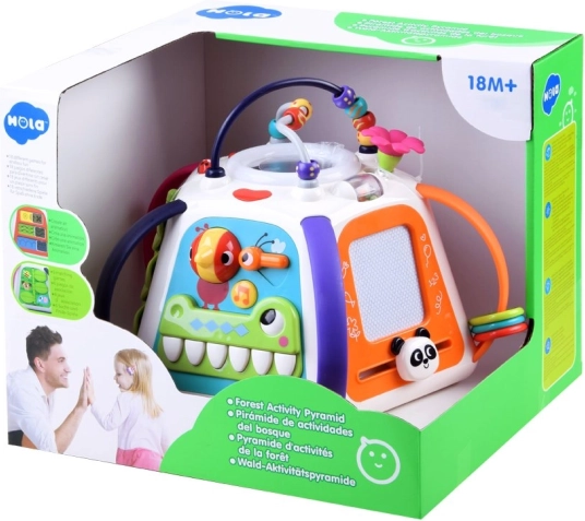 Vzdelávacia multikocka HOLA prináša bohaté spektrum aktivít v jednej kompaktnej hračke. Každá strana ponúka inú zručnosť: od kreslenia na zmazávaciu tabuľku, cez otáčanie ozubených koliesok, po objavovanie zvieratiek pod lístkami so zvukovou odozvou. Hornú časť zdobí korálkový labyrint, ktorý podporuje koordináciu ruka-oko.