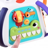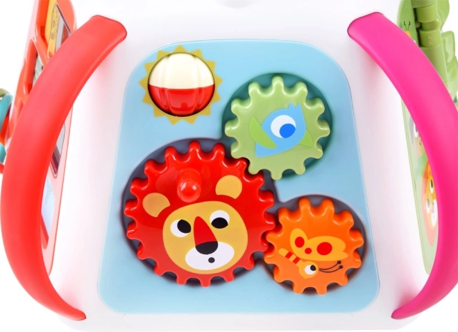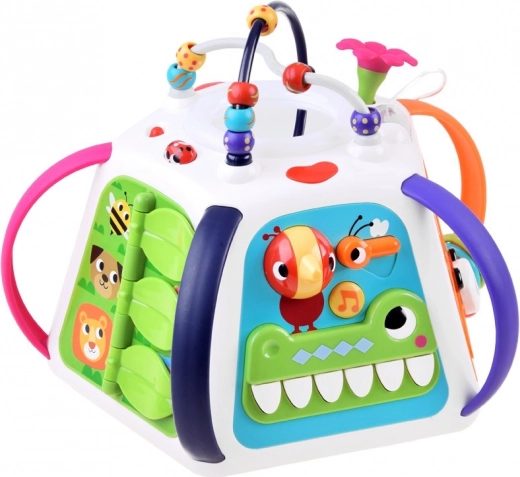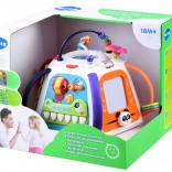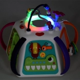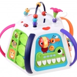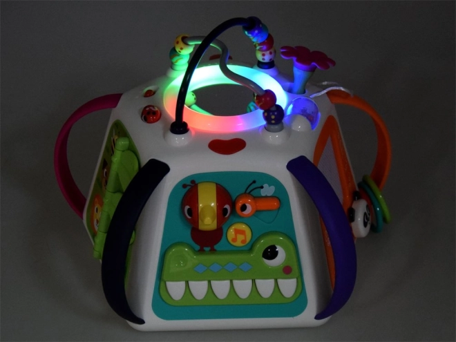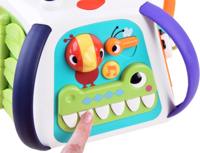 Po zapnutí spustí kocka melódie, zvukové efekty a svetelné prvky, ktoré deti motivujú k ďalšiemu skúmaniu. Nechýba pianíno v podobe krokodílích zúbkov, pohyblivé prvky, posuvné panely s optickým efektom „živej“ animácie ani bezpečné zrkadielko.