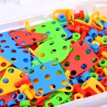 Štvorce, trojuholníky, kolieska a perforované diely v pestrých farbách podporujú kreativitu, priestorové myslenie a logické plánovanie.