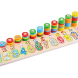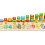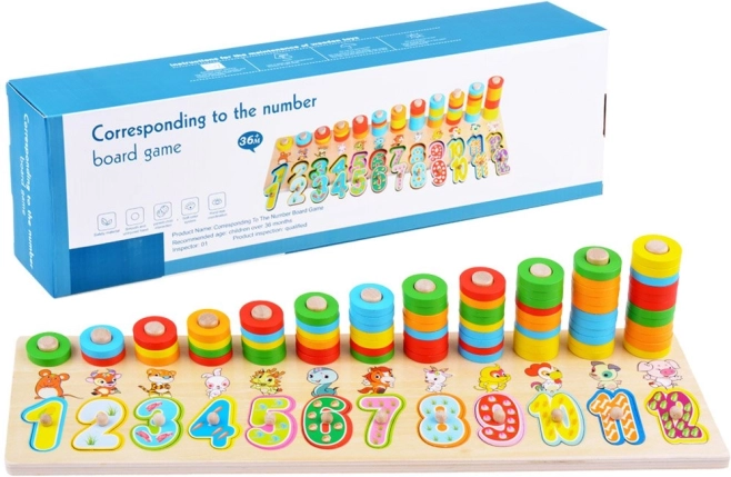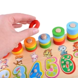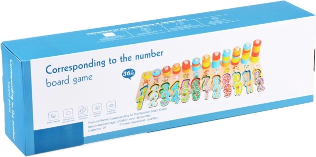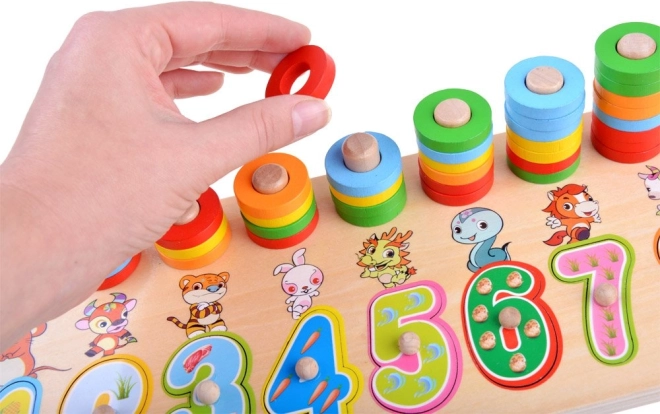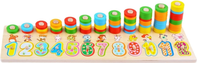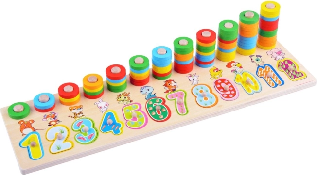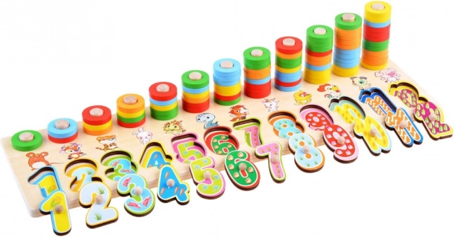 Táto vzdelávacia drevená hračka kombinuje skladanie tvarov, triedenie farieb a prvú matematiku. Deti vkladajú veľké číslice do správnych otvorov a navliekajú farebné krúžky na kolíky, čím ľahko pochopia hodnotu čísel a základné počítanie. Ilustrácie zvieratiek pri jednotlivých číslach podporujú pamäť a rozvoj slovnej zásoby.