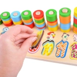Navliekanie krúžkov na kolíky a vkladanie číslic trénuje jemnú motoriku, koordináciu oko–ruka a sústredenie.