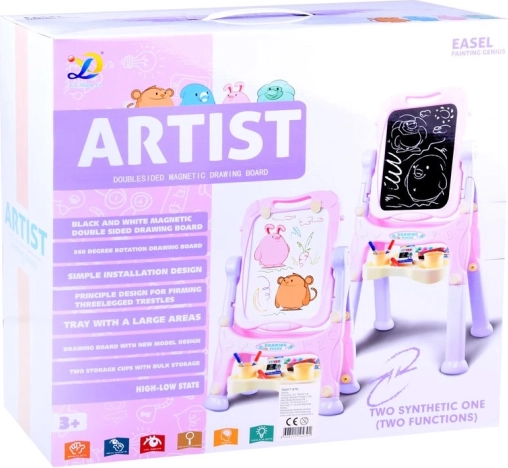 Táto farebná obojstranná tabuľa ponúka všetko pre malých umelcov: na čiernej strane možno písať kriedou, biela magnetická strana je vhodná pre suchostierateľné fixky, magnetky alebo pripnutie papierov na maľovanie. Praktická polička a kelímky udržia kriedy, fixky a štetce vždy po ruke.