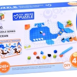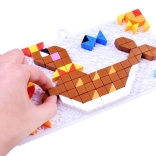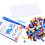 Sada obsahuje 248+ farebných kociek na tvorbu pestrých mozaík. Deti môžu skladať motívy podľa predlôh (napr. zvieratká či oceánske scény) alebo vymýšľať vlastné obrázky.