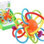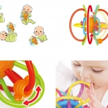 Táto kreatívna „guľa“ s prepletenými slučkami a korálikmi je navrhnutá tak, aby prirodzene prebúdzala detské zmysly. Pružné a poddajné slučky sa príjemne držia aj tým najmenším rúčkam, zatiaľ čo hladký, mäkký povrch jemne masíruje ďasná. Posuvné koráliky a jemné hrkotanie podporujú sluchové vnímanie a sústredenie.