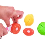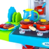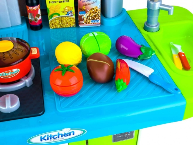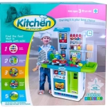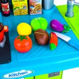 Súčasťou je bohatá sada doplnkov: zelenina na suchý zips na krájanie, hrniec, panvica, riad, príbory, kanvička a imitácie potravín. Kuchynka rozvíja jemnú motoriku, kreativitu a učí deti základom domácich povinností.
