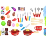 Zelenina na suchý zips na krájanie, hrniec s pokrievkou, panvica, taniere, šálky, príbory, kanvica a imitácie potravín – všetko pre kompletný kuchynský kútik.