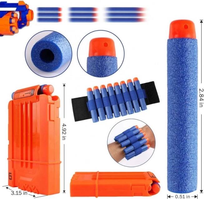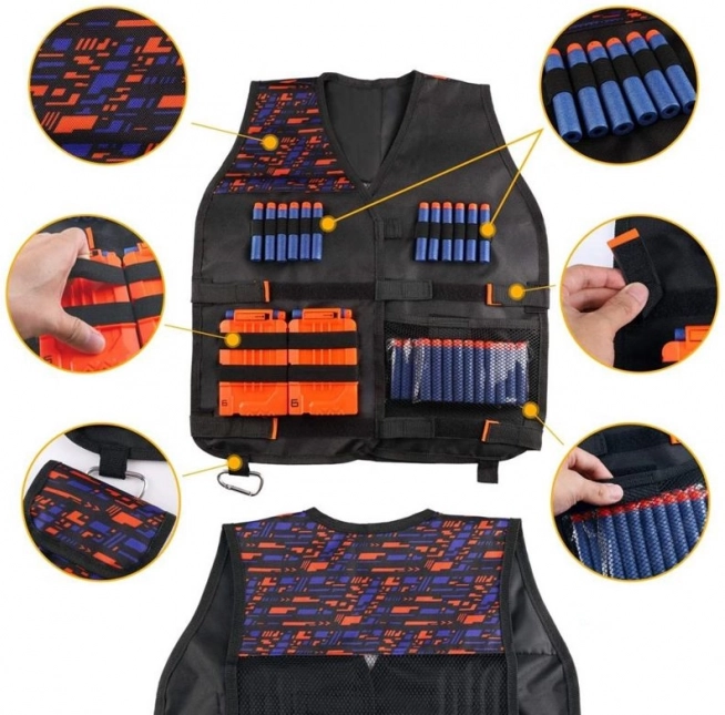 Obsah sady: Sada obsahuje taktickú ochrannú vestu, ochranné okuliare, 30 šípok, šatku s potlačou na tvár, nábojový pásik na nosenie na zápästí a ďalší zásobník nábojov.