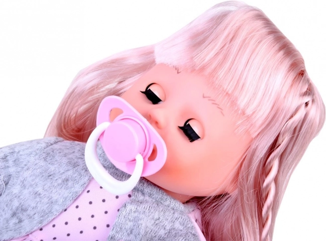 Táto mäkučká bábika s realistickými prvkami poteší každé dieťa. Hlava, ruky a nohy sú z jemnej gumy, telíčko je vyplnené príjemným plyšom – ideálne na maznanie. Bábika má dlhé vlásky, roztomilý outfit a zatváracie oči pri položení na chrbát.