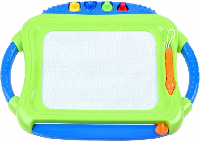 Tabuľa má praktické madlá, stylus na šnúrke a prehľadné tlačidlá pre jednoduchú manipuláciu aj pre malé detské ruky.