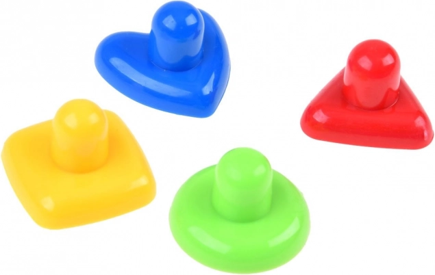 Štyri farebné pečiatky – srdce, trojuholník, štvorec a kruh – podporujú rozpoznávanie tvarov a farieb aj rozvoj jemnej motoriky.