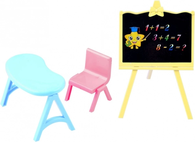Kompletná výbava na hru na školu. Deti môžu písať na tabuľu, posadiť bábiku k lavici a vytvárať vlastné vyučovanie.
