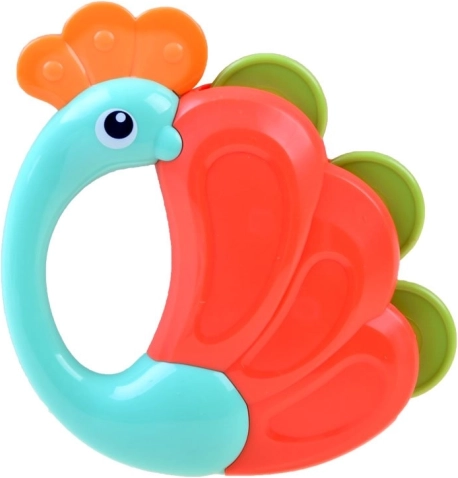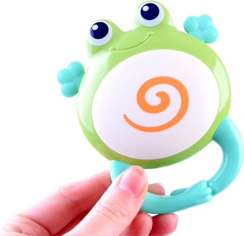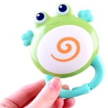Toto hrkálko má veselý žabkový dizajn s tyrkysovou rukoväťou a oranžovým vírom na brušku. Ponúka zábavu a stimuláciu pre deti.