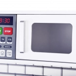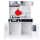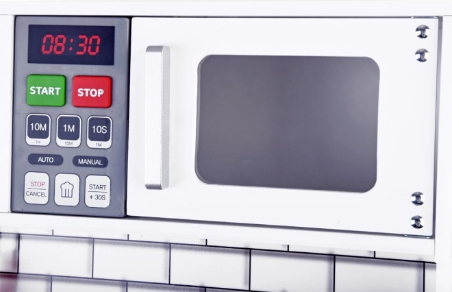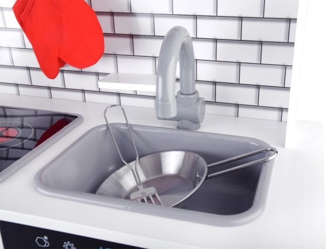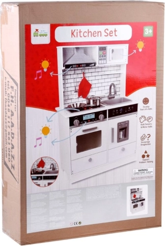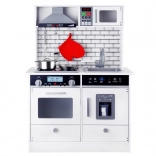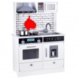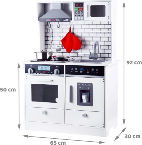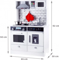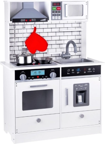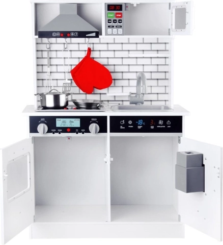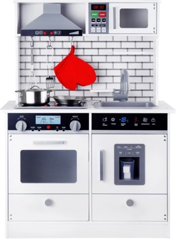 Táto krásna drevená kuchyňa je vybavená všetkými potrebnými spotrebičmi, ktoré umožnia deťom variť tie najchutnejšie jedlá. Štylizácia v bielom prevedení s modernými kachličkami bude dokonale ladiť do akéhokoľvek detského izba alebo kuchynského kúta.