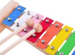 Xylofón s dúhovými kovovými klávesami umožňuje deťom objavovať melódie a rozvíjať hudobný sluch. Je ideálny pre učenie základných hudobných princípov.