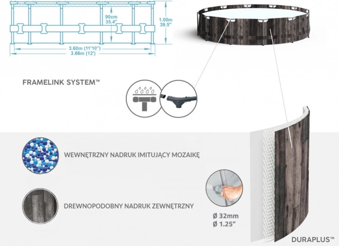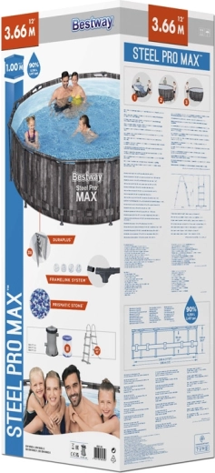 Rodinný kruhový bazén BESTWAY Steel Pro MAX s priemerom 366 cm a výškou 100 cm ponúkne osvieženie aj zábavu pre deti aj dospelých. Realistický vzor starého dreva skvele ladí so záhradou a dodáva štýl každému vonkajšiemu priestoru. Pevný oceľový rám s FrameLink System zvyšuje stabilitu a chráni spoje proti korózii. Odolná vložka z materiálu DuraPlus (polyesterové jadro + dve silné vrstvy PVC) garantuje dlhú trvácnosť a spoľahlivosť.