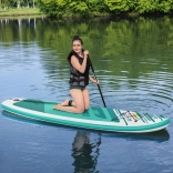 Doska sa ľahko prenáša pomocou stredového madla a po jazde ju rýchlo vyfúknete a uložíte do priestranného batohu. Vďaka šírke 84 cm je veľmi stabilná – vhodná pre začiatočníkov, cvičenie jogy na SUP aj výlety; široká plocha paluby poteší aj majiteľov psov.