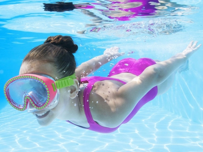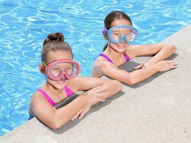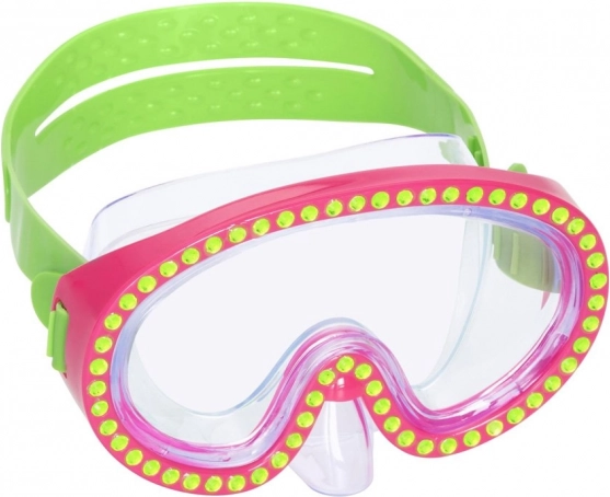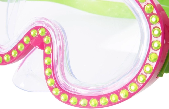 Plavecká maska je ozdobená kryštálmi, ktoré dodávajú maske jedinečný a elegantný vzhľad, zatiaľ čo si deti užívajú plávanie.