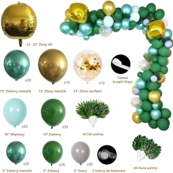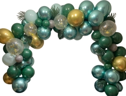 Montáž je jednoduchá: balóniky nafúknite vzduchom či héliom a upevnite do pásky s očkami. Menšie balóniky rozmiestnite po obvode pre plný a vrstvený efekt. Tropické a palmové listy dodajú výsledku exotický nádych a perfektne ladia so zeleno–zlatou paletou.