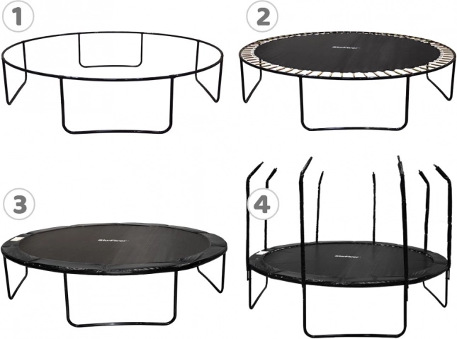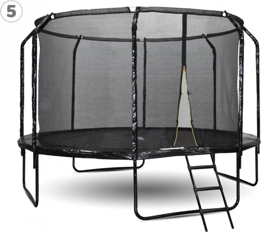 Masívny rám so silnými oxidovanými pružinami a U-nohami drží trampolínu pevne na mieste, zatiaľ čo krycí límec bezpečne zakrýva pružiny. Praktický trojstupňový rebrík uľahčuje nástup aj deťom. V balení nájdete tiež kotvy s popruhmi, vodoodolný kryt a montážne náradie – všetko pre jednoduchú inštaláciu a bezproblémovú prevádzku.