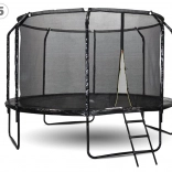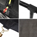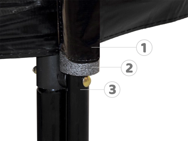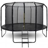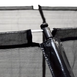 Vysoká ochranná sieť napnutá krúžkom drží tvar, vstup je zaistený zipsom a prackou. Profilované kovové stĺpiky majú mäkké polstrovanie pre bezpečné skákanie.