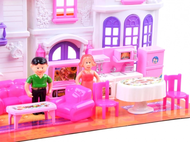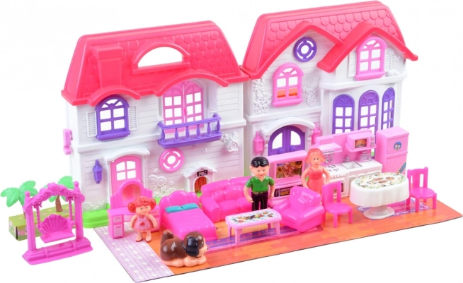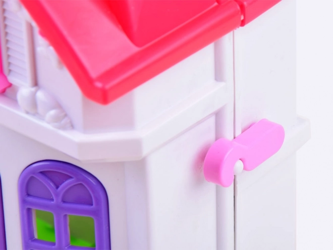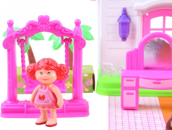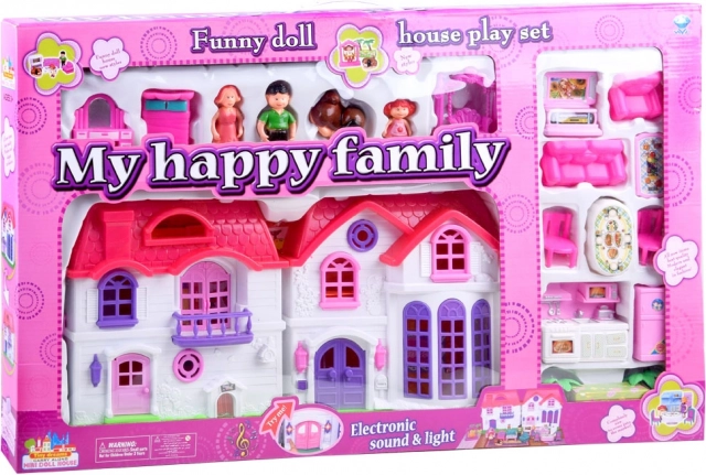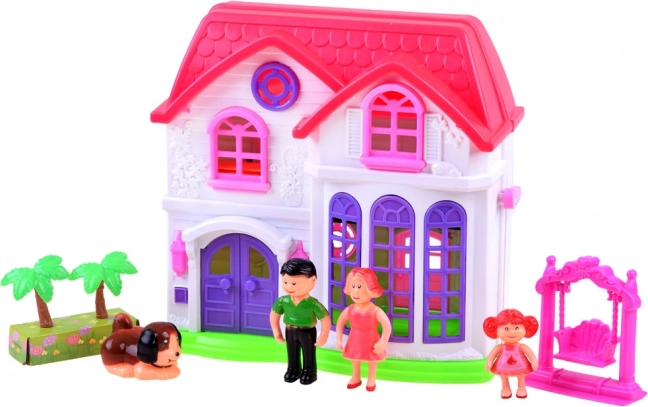 Skladací domček očarí živými farbami a detailným spracovaním – fasádu zdobia reliéfy kvietkov a vtáčikov. Po otvorení vznikne prehľadný herný priestor, kam deti ľahko rozmiestnia nábytok. Figúrky mamičky, otecka a dcéry majú pohyblivé ruky a otočnú hlavu, takže si užijete množstvo rolových hier. Praktický zvonček so svetelným efektom oznamuje príchod návštevy a dodáva hre čaro skutočného domova.