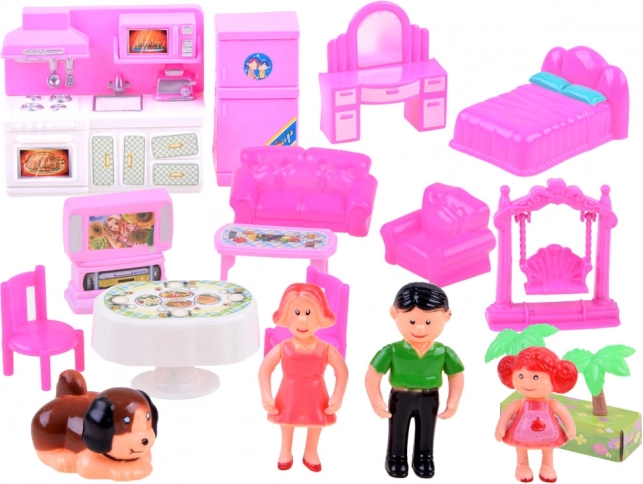 Zariaďte spálňu, obývačku aj kuchyňu – v balení nájdete posteľ, pohovku, kreslo, stôl a stoličky, TV so skrinkou, kuchynskú linku aj chladničku a k tomu figúrky rodinky a psíka.
