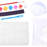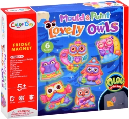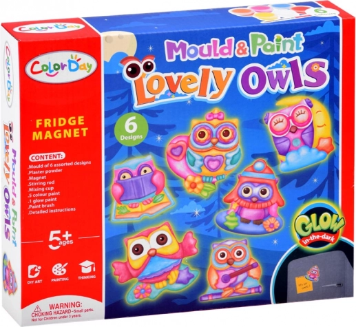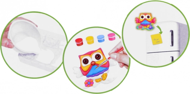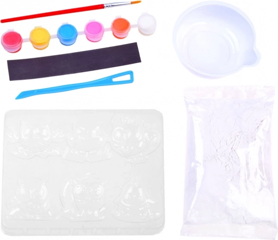 - Forma s motívmi sov, sadrový prášok, miešací kelímok, špachtľa/paletový nožík, štetec, 6 farieb, magnetická páska