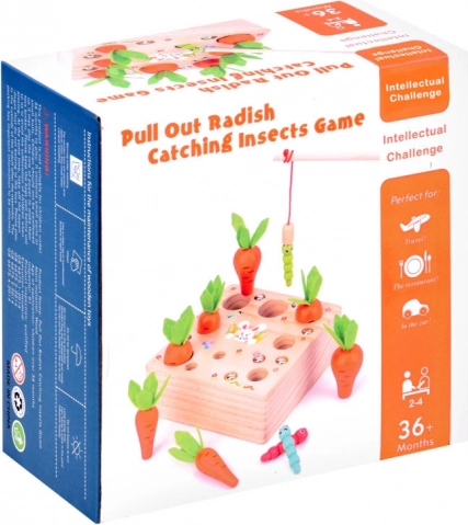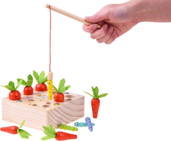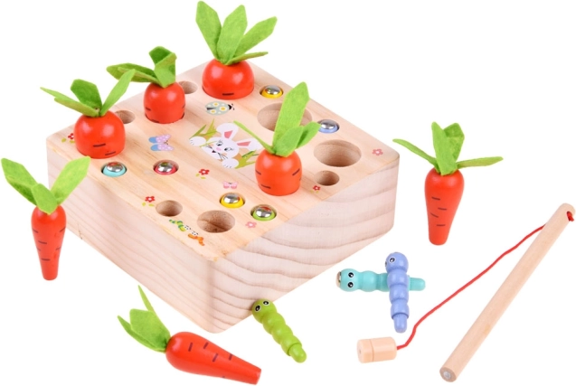 Drevená hra s mrkvičkami a červíkmi je navrhnutá pre tých najmenších, láka svojou pestrou farebnosťou a veselými motívmi. Deti môžu hravo zbierať mrkvy a červíky pomocou prútov s magnetom, čo posilňuje ich koordináciu ruka-oko a jemnú motoriku.