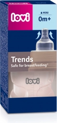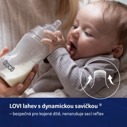 Fľaša LOVI Trends vznikla v spolupráci s odborníkmi a je klinicky testovaná. Špeciálny dynamický cumlík z tenkej vrstvy silikónu sa pri kŕmení prirodzene predlžuje a sťahuje podľa tempa dieťaťa, zatiaľ čo pevná, široká, profilovaná základňa poskytuje stabilnú oporu perám a bráni okusovaniu. Antikolicový systém SUPER-vent obmedzuje prenikanie vzduchu do mlieka, a tým pomáha predchádzať kolikám.