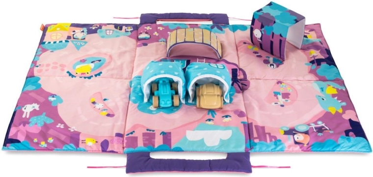Dieťa môže spolu s touto mäkkou podložkou stráviť hodiny plné báječných dobrodružstiev. Podložka pomáha rozvíjať zmysly a predstavivosť dieťaťa tým, že ponúka mnoho senzorických prvkov, ako sú šuštivé prvky, most, tunel, cesty a vrecká pre autíčka.