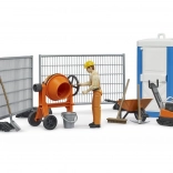 Miešačka, vibračná doska, fúrik, náradie, zábrany a mobilná toaleta vytvárajú autentické scény a podporujú kreatívne hranie.