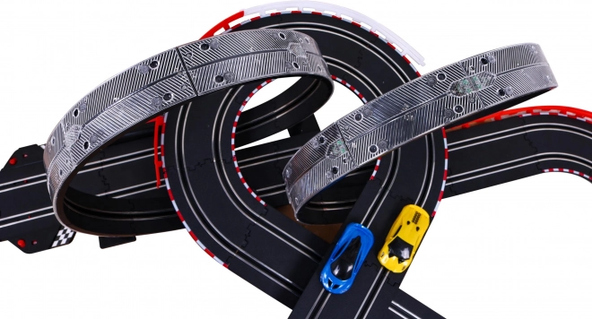 Čierna dráha s bielymi a červenými detailmi ponúka slučky a zákruty pre dynamickú pretekársku hru. Je navrhnutá pre trvácnosť a zábavu.