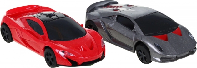 Set obsahuje dve pretekárske autíčka, červené a sivé, navrhnuté ako športové vozy s výraznými spojlermi a čiernymi kolesami.