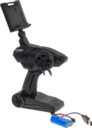 Auto v mierke 1:14 je poháňané batériou Li-Pol 3,7V, čo zaisťuje dlhý čas prevádzky. Ergonomicky tvarovaný diaľkový ovládač na frekvencii 2,4GHz umožňuje precízne riadenie a rozhranie pre montáž telefónu poskytuje pohodlie pri používaní kamery.