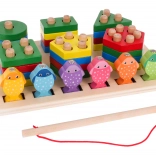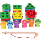 - drevený stojan s kolíkmi a priehlbinami, - 4 kolieska, .- 4 obdĺžniky, .- 4 trojuholníky, .- 4 štvorce, .- 4 päťuholníky, .- 4 šesťuholníky, .- 6 rýb, .- rybársky prút s magnetom. . |