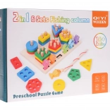 Sada 2 v 1, drevené puzzle a chytanie rybičiek je určená pre deti od 3 rokov. Sada sa skladá z drevenej základne s kolíkmi a obdĺžnikovými priehlbinami. Na kolíky sa ukladajú farebné bloky so zaoblenými koncami a v rôznych tvaroch a do priehlbín sa vkladajú ryby. Nachádzajú sa tu rôzne farebné geometrické tvary, napríklad kruh, obdĺžnik, trojuholník, štvorec, päťuholník a šesťuholník. Kruh má jeden otvor, obdĺžnik dva, trojuholník tri, štvorec štyri, päťuholník päť a šesťuholník šesť. Úlohou batoľaťa je šikovne priradiť určitý obrazec k danému počtu kolíkov. Okrem toho je na hracej ploche hra na chytanie rybičiek. Hra spočíva v umiestňovaní rybičiek s magnetmi do obdĺžnikových otvorov pomocou magnetického rybárskeho prúta. Sada je ideálna na rozvoj manuálnej zručnosti, precvičuje motorickú, hmatovú a zrakovú koordináciu batoľaťa. Dieťa rozvíja predstavivosť a podnecuje kreativitu. |