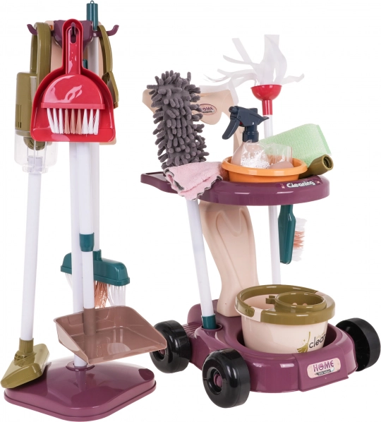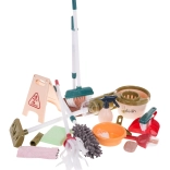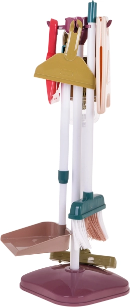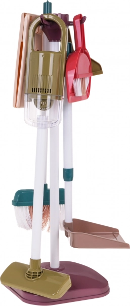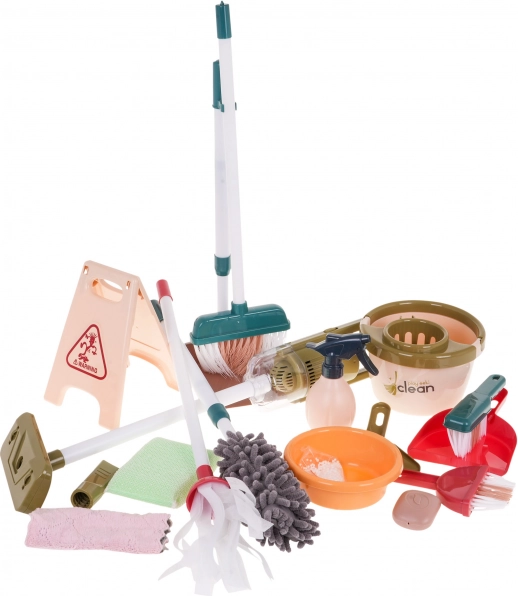 Detský upratovací set zahŕňa nástroje ako mop, kefy, metly a malý vysávač, ktoré napodobňujú skutočné náradie a prinášajú do hry realistickosť.