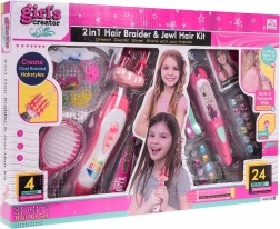 - pletiaci strojček, - strojček na nanášanie šperkov na vlasy, - 2 x sponka do vlasov, - 24 x šperk do vlasov (diamanty), - 24 x kolíčky na šperky do vlasov, - kefa na vlasy, - 64 gumičiek do vlasov v krabičke s priehradkami, - návod. |